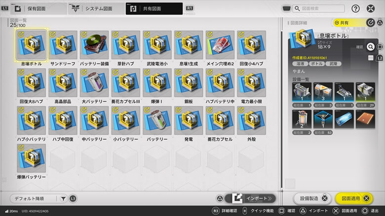 フレンド間での共有はもちろん、SNSや動画サイトなどで公開されている図面IDを入力すれば、拠点の配置をそのまま再現することも可能です。